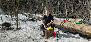 А вот в лесу всё еще снежно. Местами, глубокие лужиМестами открывается земля, но Мать-и-Мачеху еще не взошла.Сворачиваем вглубь, и тут уже с тропы не сойдешь, провалишься по колено в снег!Погода солнечная и тёплая (+13° С по прогнозу), ветра нет, можно снимать верхнюю одежду!Положили трансивер PFR-3 с собой. Это вообще - всё, что относится к теме радио! Полотно, противовес, наушники, ключ, карандаш, блокнот, аккумуляторы. Антенна - луч на дерево, длинной 10 метров.LED экран на солнце не читается